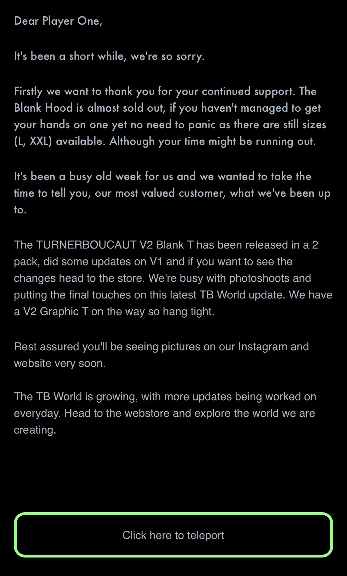 The first email I wrote for them that was sent out to customers. Debuting the new voice with a restocked product. The tone switched from dry to conversational, with a dash of sarcasm, and the call to action is now unique to the TurnerBoucaut vision.