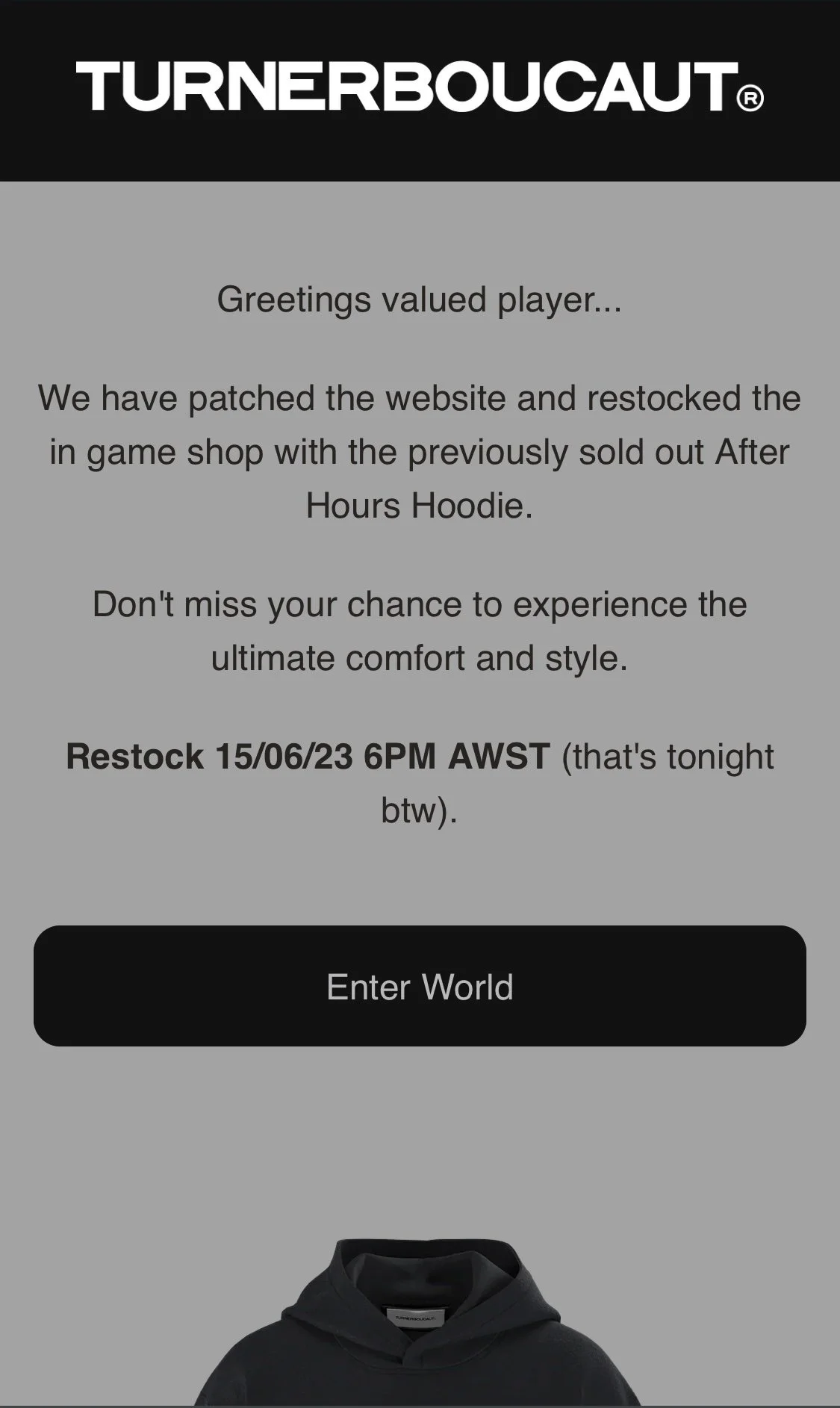 Just a week later we sent out this small newsletter. Over the course of two weeks the TurnerBoucaut email marketing was overhauled, and the results showed. Their hoodie restock was almost completely gone and, email conversion rate was up 31%.
